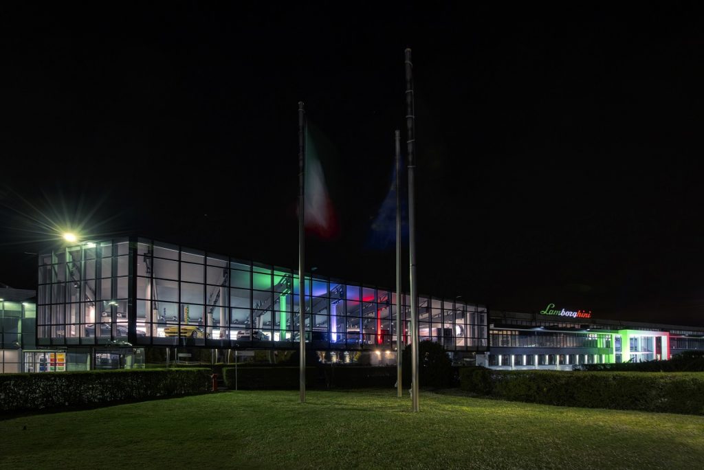 林寶堅尼汽車公司位於聖亞加塔·波隆尼的歷史悠久的總部大樓,現在每晚點亮與意大利三色國旗同色的燈光,以展現林寶堅尼與整個國家團結一心、共同抗擊新冠肺炎疫情的決心。