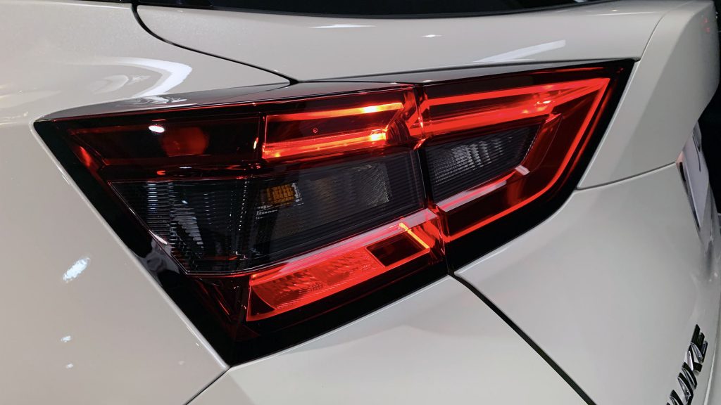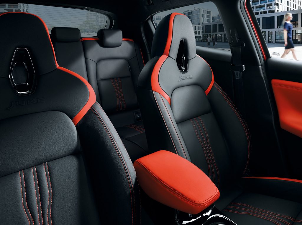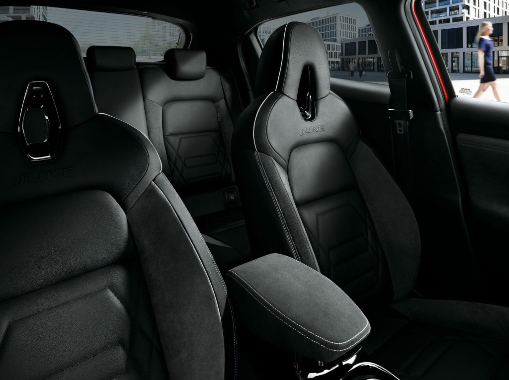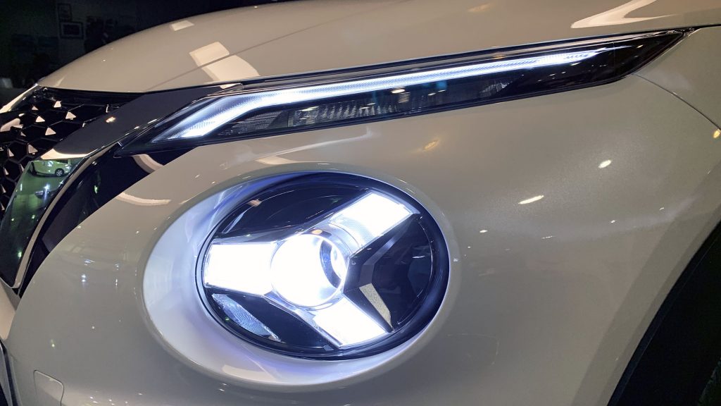 JUKE 車系標誌性上下分離式頭燈,採用全 LED 設計,上層日行燈內藏指揮燈,日產家族式 V-Motion 鬼面罩兩端延伸,造型更修長俐落,下層圓型大燈採用彷如日本忍者回力鏢的 Y 型光源座,令 JUKE Turbo 於路上辨識度更高、玩味設計及性格更突出。