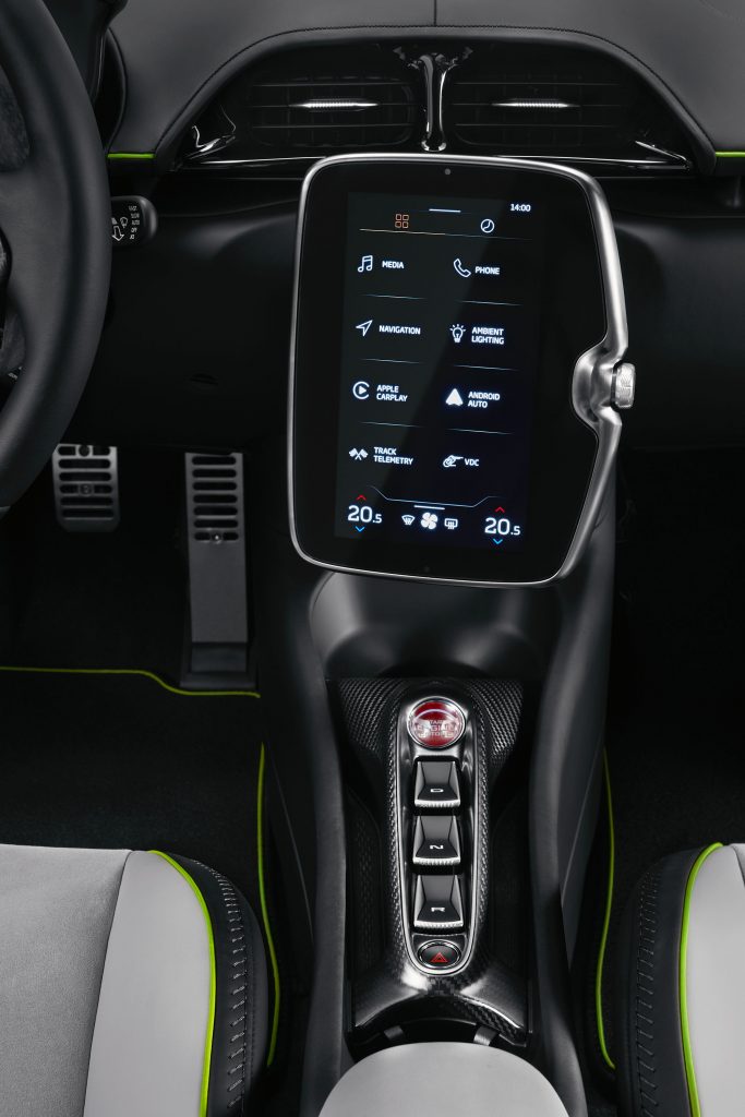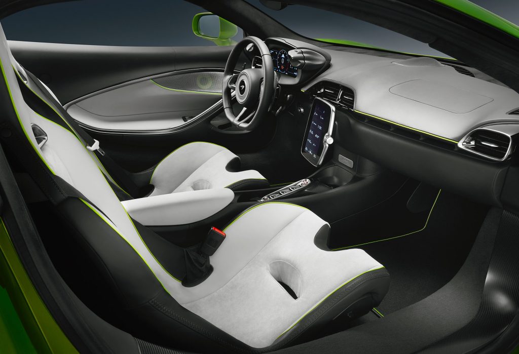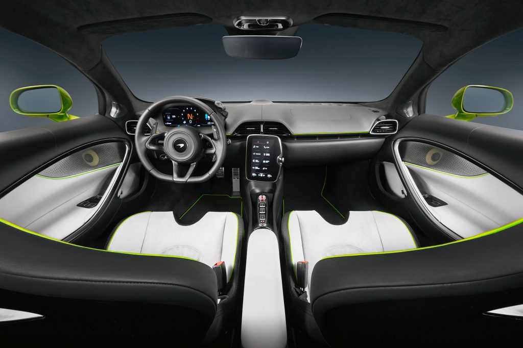 在車廂全新Artura設計同樣極富McLaren家族特徵,同樣搭載全液晶儀錶盤和大尺寸中控屏,儀錶板具備隱藏模式,令駕駛者專注前方道路。而上述兩塊屏幕同時也是McLaren信息娛樂系統的一部分,在支持導航、手機投射功能外,同時也提供McLaren專屬的應用程序,其中包括McLaren賽道遙測系統(MTT)及可變飄移控制系統(VDC)等。