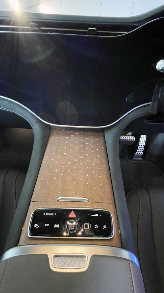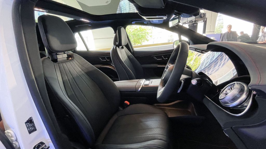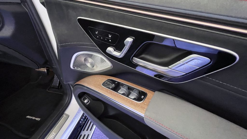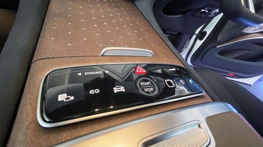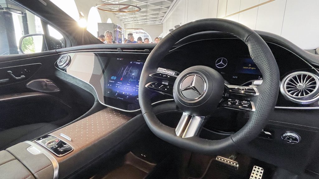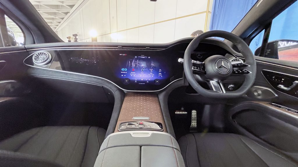 車廂最吸引的重點是 MBUX Hyperscreen (EQS SUV 580 4MATIC 為標準配置;EQS SUV 4504MATIC 為可選配)。這個大型曲面屏幕幾乎橫跨左右A柱。三個屏幕位於同一塊玻璃片下, 並在視覺上融合在一起。左方的 12.3 吋 OLED 顯示屏為前座乘客提供了屬於自己的顯示和控制區域。
